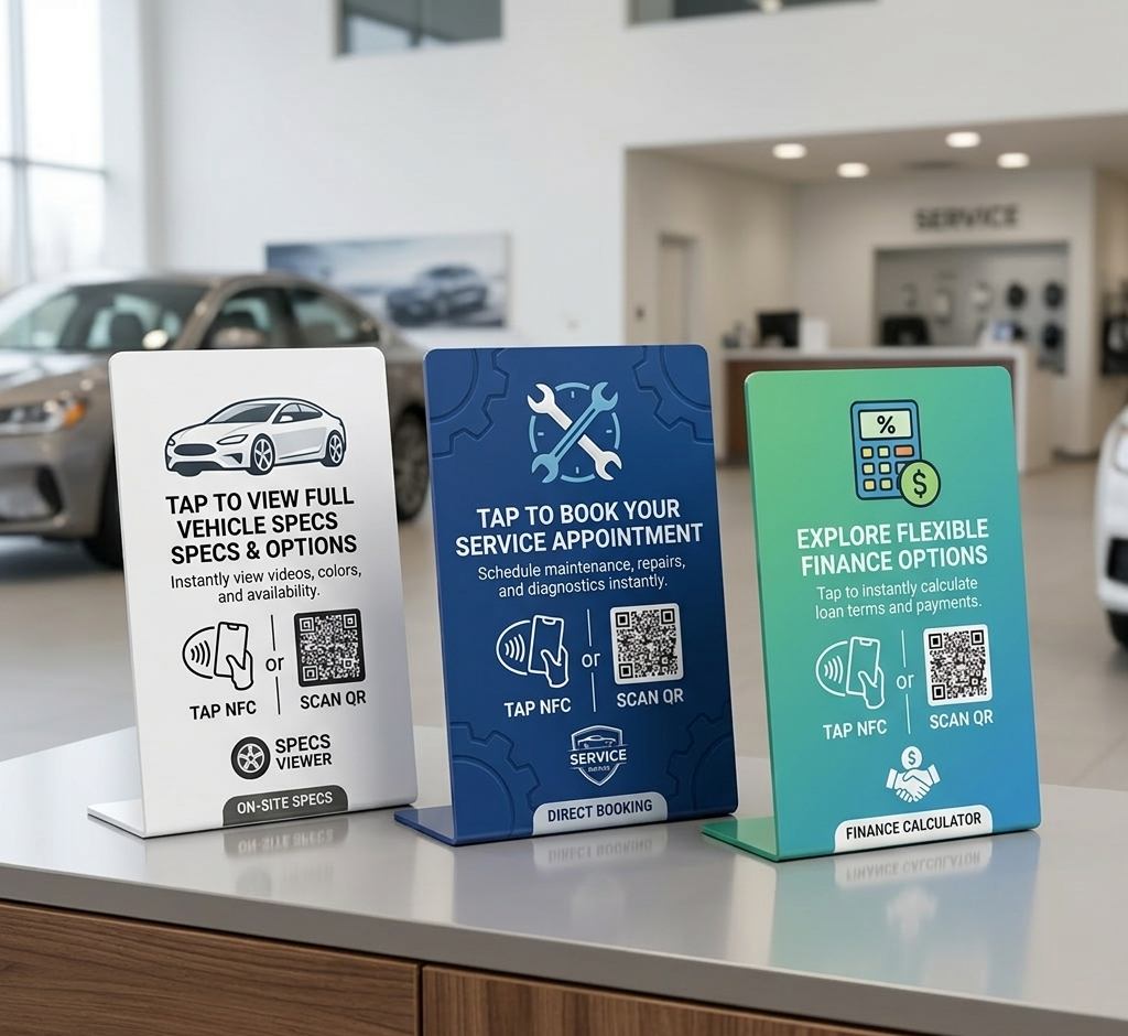 Perfect for car dealerships, retail stores, hospitality venues, service centres, salons and showrooms, NFC stands provide a modern, contactless way to connect with customers and grow your online presence.